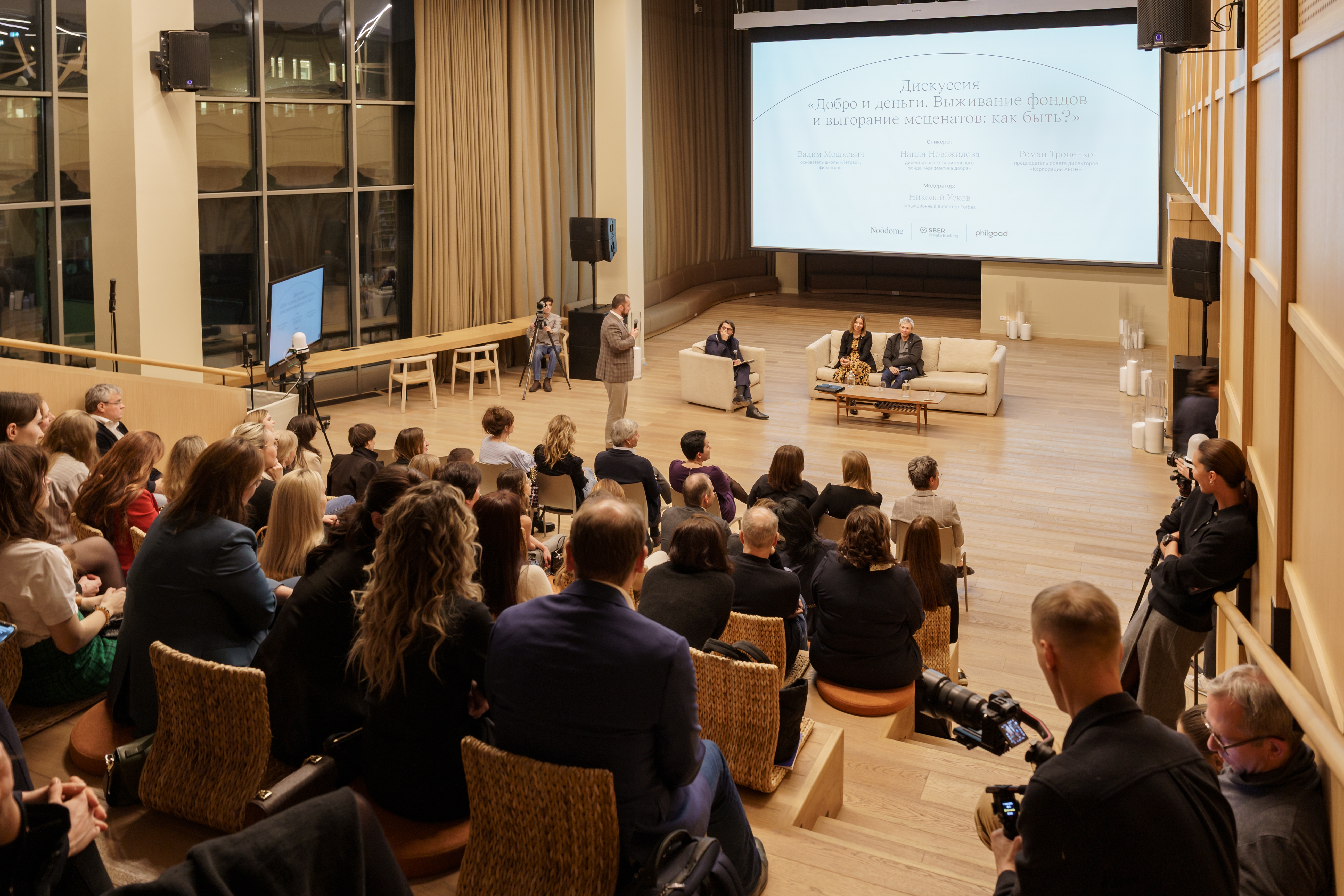 Презентация сопровождалась закрытой дискуссией «Добро и деньги. Выживание фондов и выгорание меценатов: как быть?». Дискуссию модерировал редакционный директор Forbes Николай Усков, среди ее участников — сооснователь и президент сообщества Noôdome Вероника Зонабенд, филантроп и основатель школы «Летово» Вадим Мошкович, председатель совета директоров «Корпорации АЕОН» Роман Троценко, директор благотворительного фонда «Арифметика добра» Наиля Новожилова, соучредитель благотворительного фонда «Галчонок» Юлия Пересильд, член попечительского совета благотворительного фонда Константина Хабенского Илья Зибарев, директор благотворительного фонда «Подари жизнь» Екатерина Шергова и другие приглашённые гости.